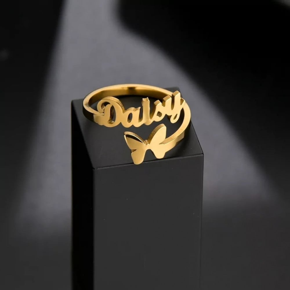 تصميم عريض للاسورة، في طرفها الاسم والطرف الأخر فراشة، مطلية بالذهب عيار 21.